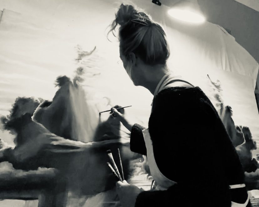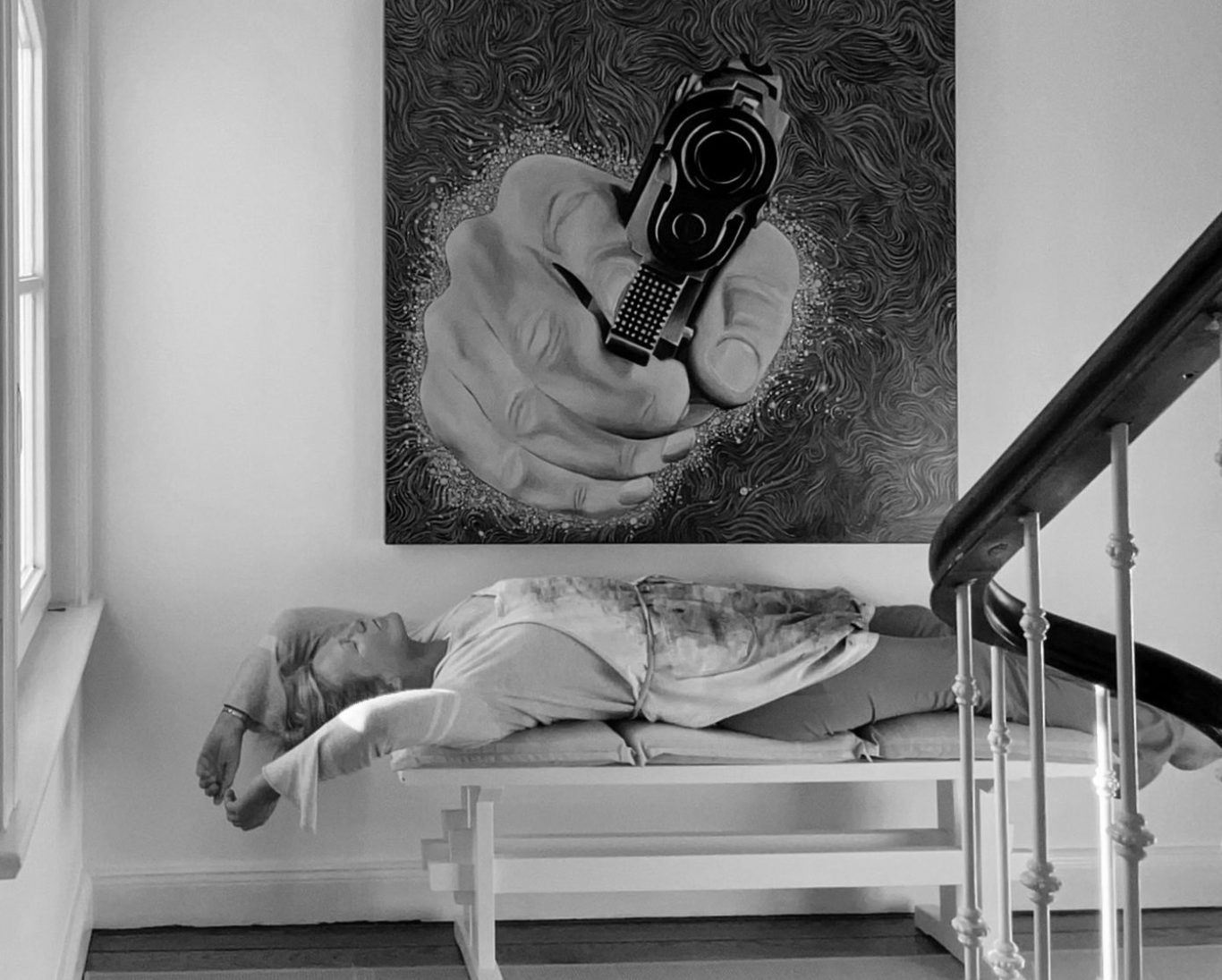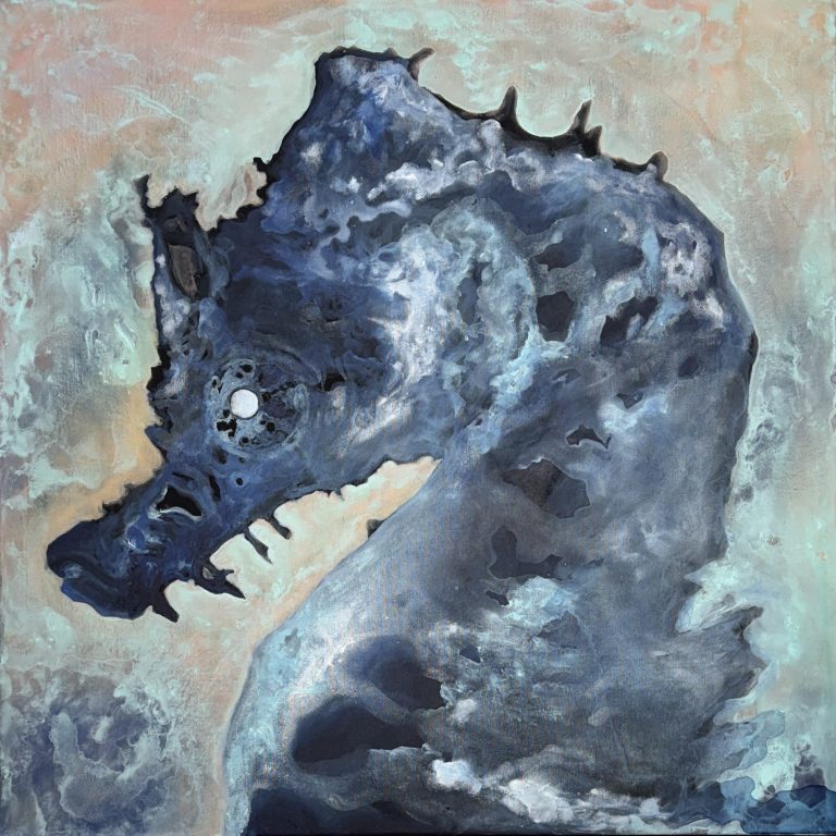 Dieses Bild habe ich während des Corona Lockdowns gemalt – diese Arbeit war für mich wie ein Kokon in einem Multiversum unserer Spezies. Unsere Erde ist so winzig und zerbrechlich. Was ist um uns herum? Die unlösbare Frage nach der Unendlichkeit ... das wollte ich mit dieser Arbeit anstoßen. Die Idee eines schützenden Kokons war mein Gefühl von Sicherheit und Isolation – gleichzeitig symbolisiert diese Hülle auch Transformation – eine Phase des Rückzugs, die letztendlich zu etwas Neuem führen kann ... Das Zentrum mit der Erde soll in diesem Kontext das Herz sein, das wir beschützen, während wir uns in dieser unendlichen Weite bewegen. Das Skelett des Seeigels manifestiert mit seiner Struktur die unzähligen Welten und Realitäten, die wir als Möglichkeit der Neufindung anstreben können.