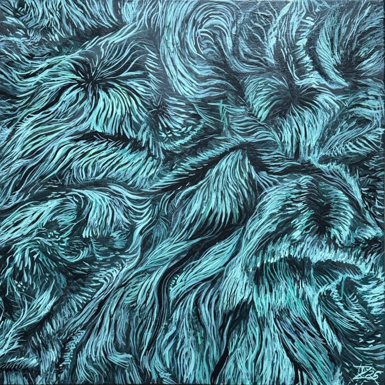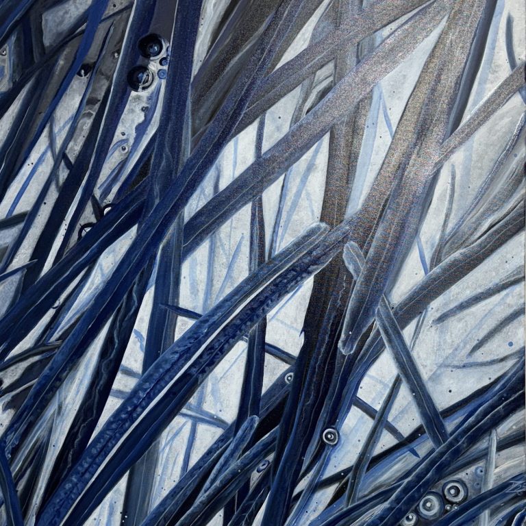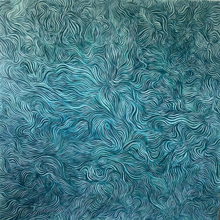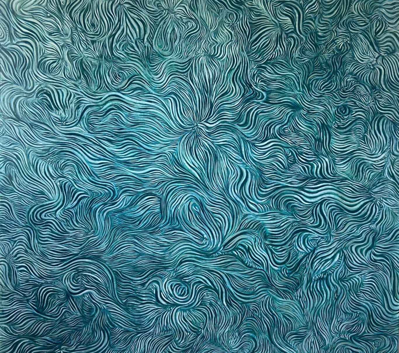 Seegras von oben betrachtet sind in gläsernen Grüntönen entstanden. Alles bewegt sich in Ströhmungen, miteinander, füreinander und halten sich in fliessender Strukturen.