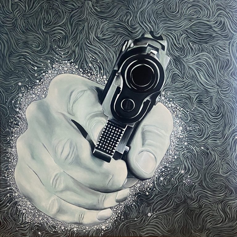 Dieses Bild habe ich während des Corona Lockdowns gemalt – diese Arbeit war für mich wie ein Kokon in einem Multiversum unserer Spezies. Unsere Erde ist so winzig und zerbrechlich. Was ist um uns herum? Die unlösbare Frage nach der Unendlichkeit ... das wollte ich mit dieser Arbeit anstoßen. Die Idee eines schützenden Kokons war mein Gefühl von Sicherheit und Isolation – gleichzeitig symbolisiert diese Hülle auch Transformation – eine Phase des Rückzugs, die letztendlich zu etwas Neuem führen kann ... Das Zentrum mit der Erde soll in diesem Kontext das Herz sein, das wir beschützen, während wir uns in dieser unendlichen Weite bewegen. Das Skelett des Seeigels manifestiert mit seiner Struktur die unzähligen Welten und Realitäten, die wir als Möglichkeit der Neufindung anstreben können.