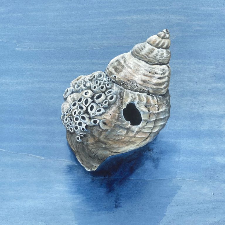Wellhornschnecke mit Pocken (Krebstierchen) ... lebten im Zusammenklang und sind auch im Skelett eine Einheit. Wer auch immer dieses Loch zum Ende dieser Lebensgemeinschaft geführt hat ... ist der Grund für deren Ende gewesen und ein Kunstwerk das ich malerisch würdige.